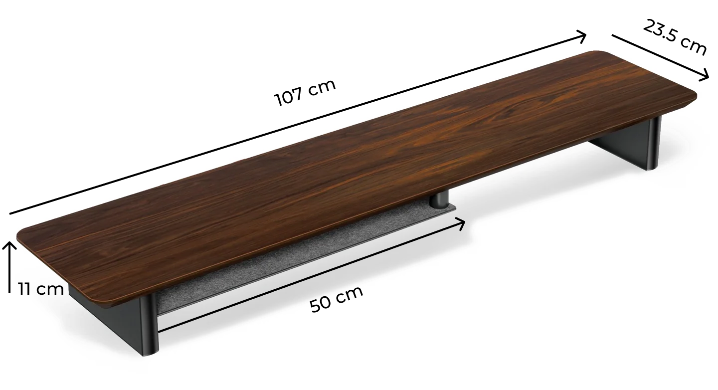 107 cm bred — rymmer två skärmar (upp till 27”) eller en ultrabred (upp till 49”).